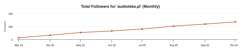 Konto TikTok Audioteki zdobyło ponad 38,9 tys. obserwujących w ciągu 12 miesięcy, a liczba ta stale rośnie z miesiąca na miesiąc. Zaczynając całkowicie od zera, udało nam się przebić największą konkurencję pod względem liczby obserwujących. Od początku 2023 roku skupialiśmy się na treściach z silnym hookiem. Ten wynik to najlepszy dowód na to, jak skutecznie rozwijała się nasza współpraca.