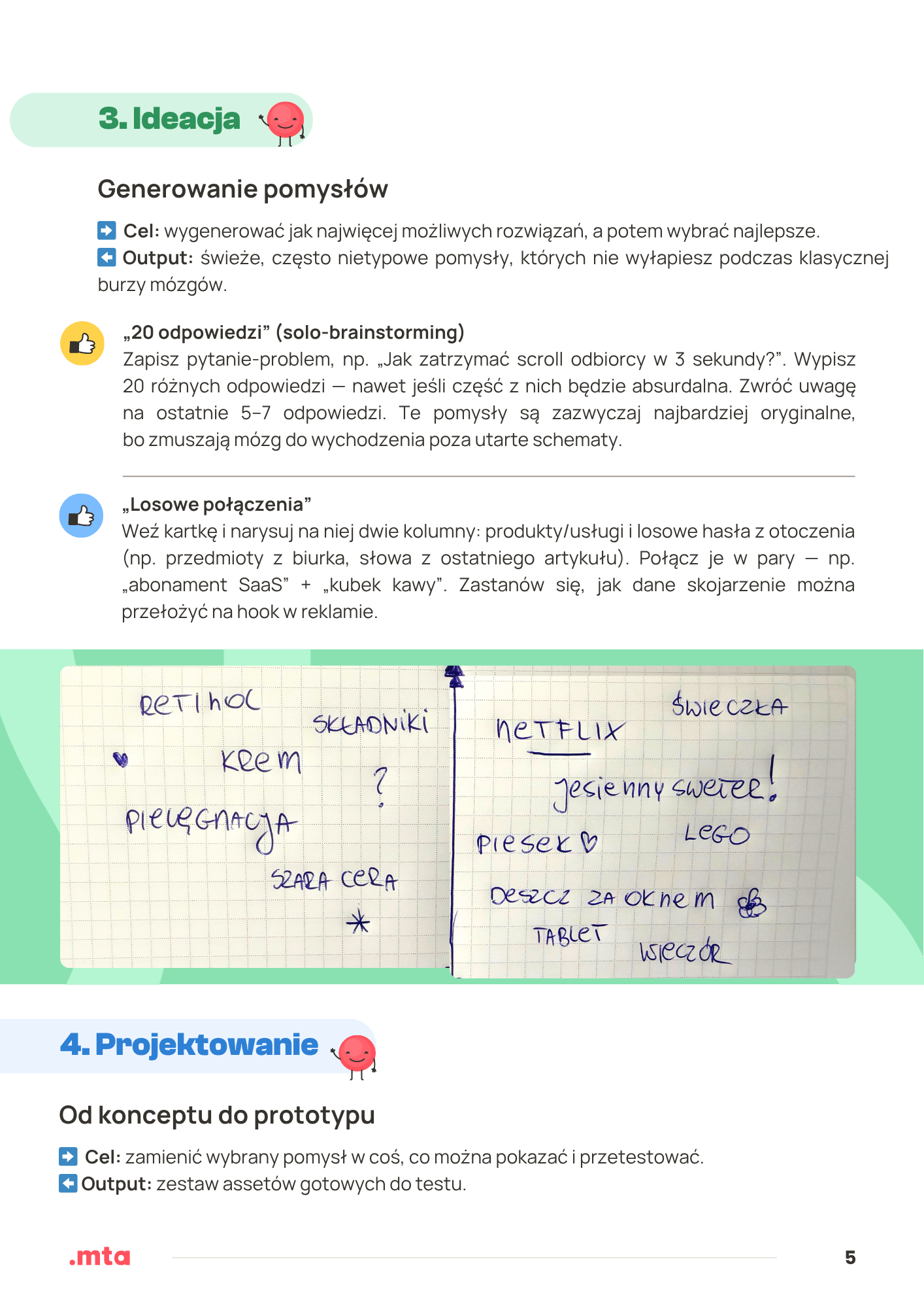 Praktyczne ćwiczeniaktóre krok po kroku przeprowadzą Cię przez analizę, research, ideację, projektowanie i testowanie kreacji.