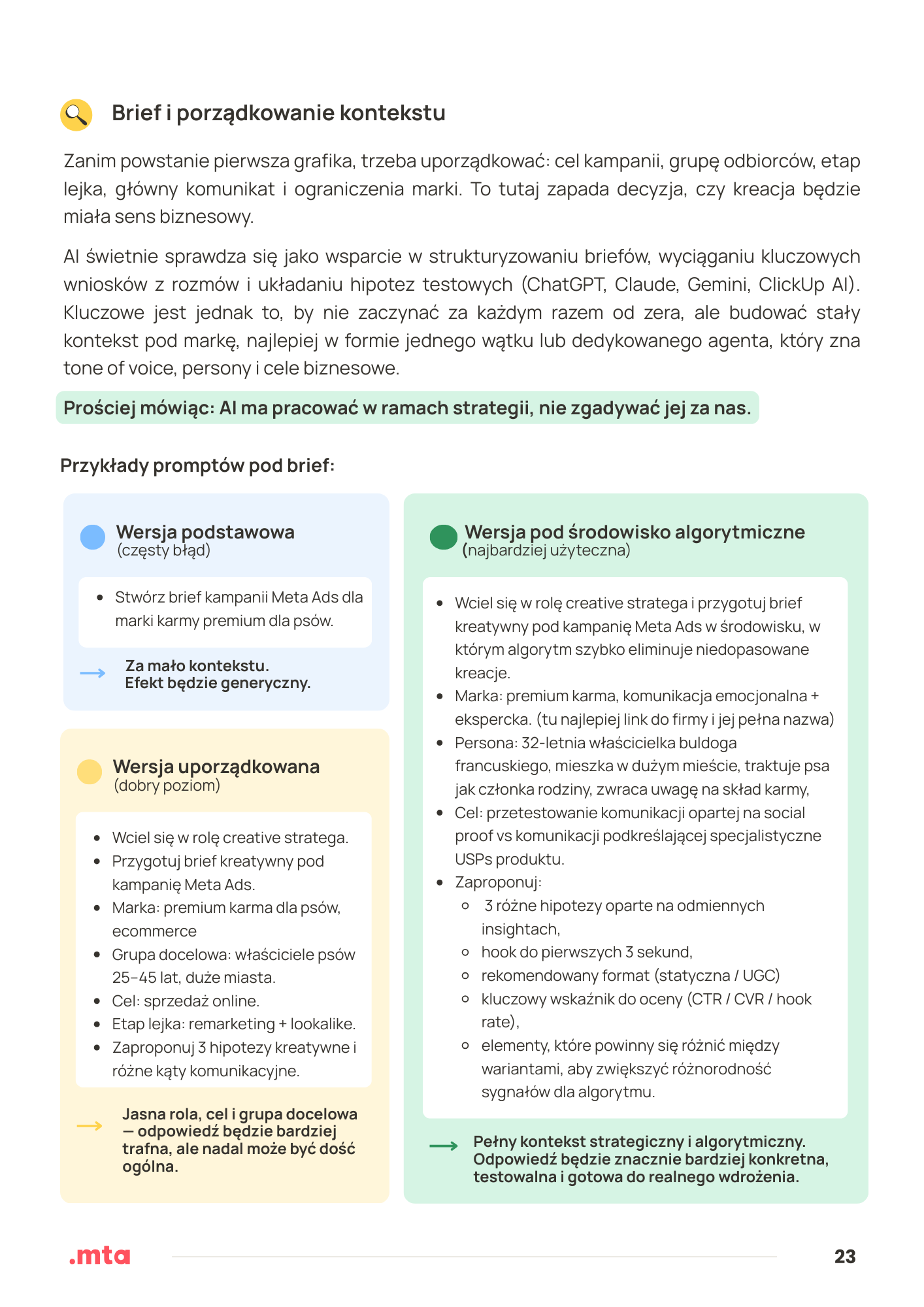 Dla strategów i creative managerówktórzy chcą uporządkować pracę nad kreacją w świecie AI — od researchu i insightów, przez projektowanie hipotez, po iterację i skalowanie.
